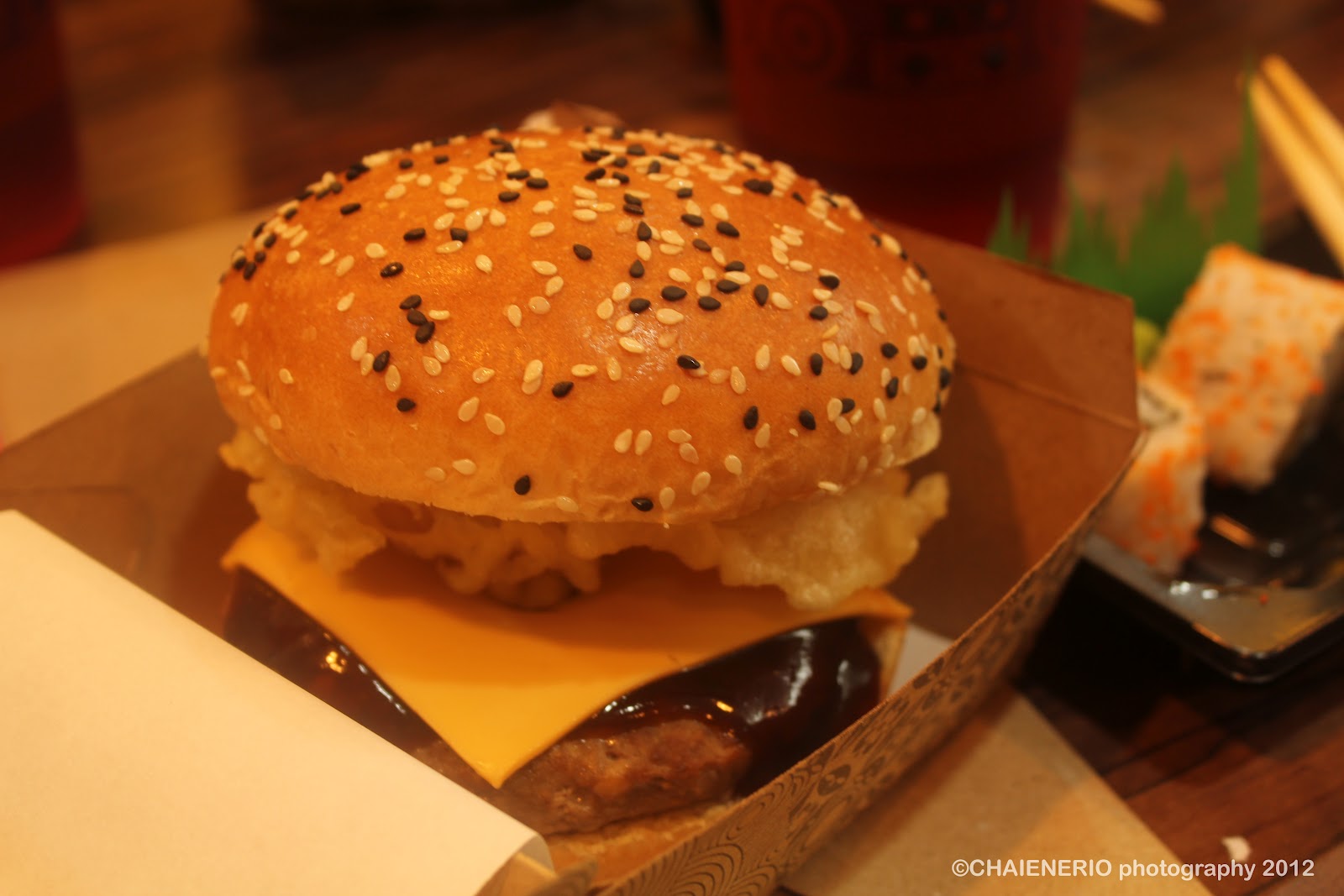 We all got to eat some California and American maki too. After the Maki session, we were presented with one of their newest products – the Shogun burger! Being true to its name, it commanded attention from all of us. Juicy beef patty slathered with their tonkatsu sauce layered with their signature crunchilicious Onion rings and cheese. They gave us 1 big burger so I took only 2 bites in preparation of the others.